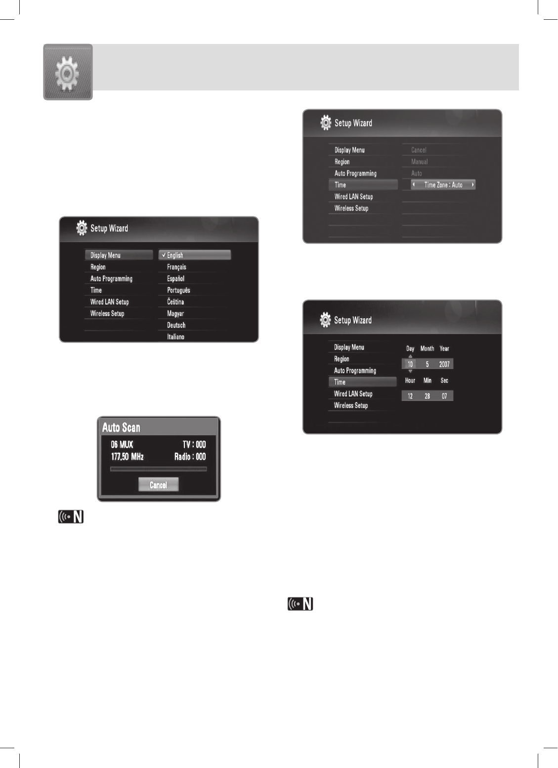 programme scan, time and network setup on the